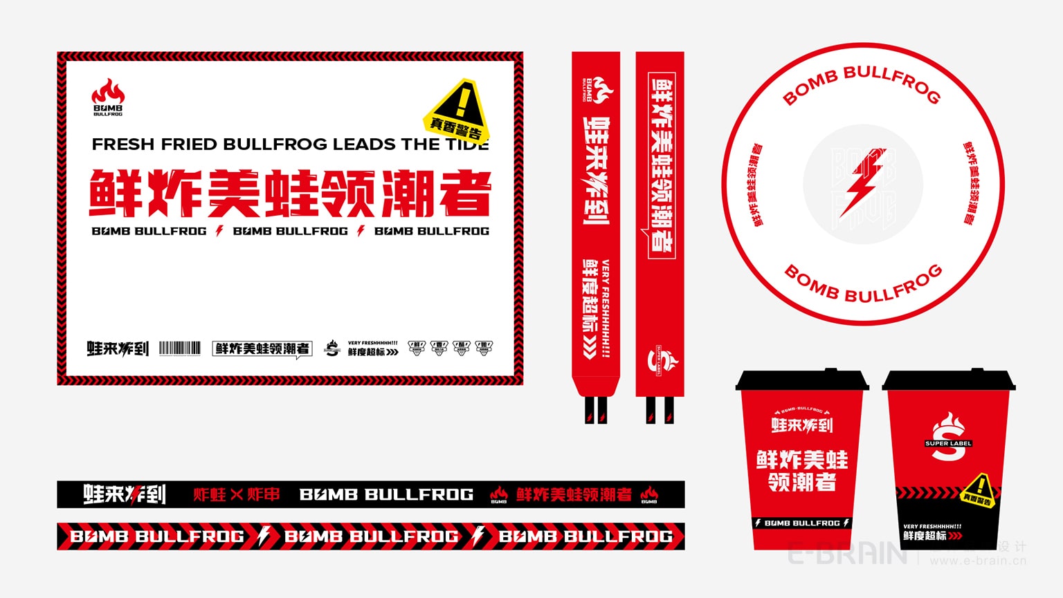 意邦將閃電、火焰等嘻哈感極強(qiáng)的元素運(yùn)用在品牌VI設(shè)計中,搭配紅色、黑色等潮流色彩,豐富了品牌的場景感受,讓潮玩吃貨一眼就形成認(rèn)同。輔助圖形蛙眼作為視覺點綴,為品牌視覺增添了趣味感。