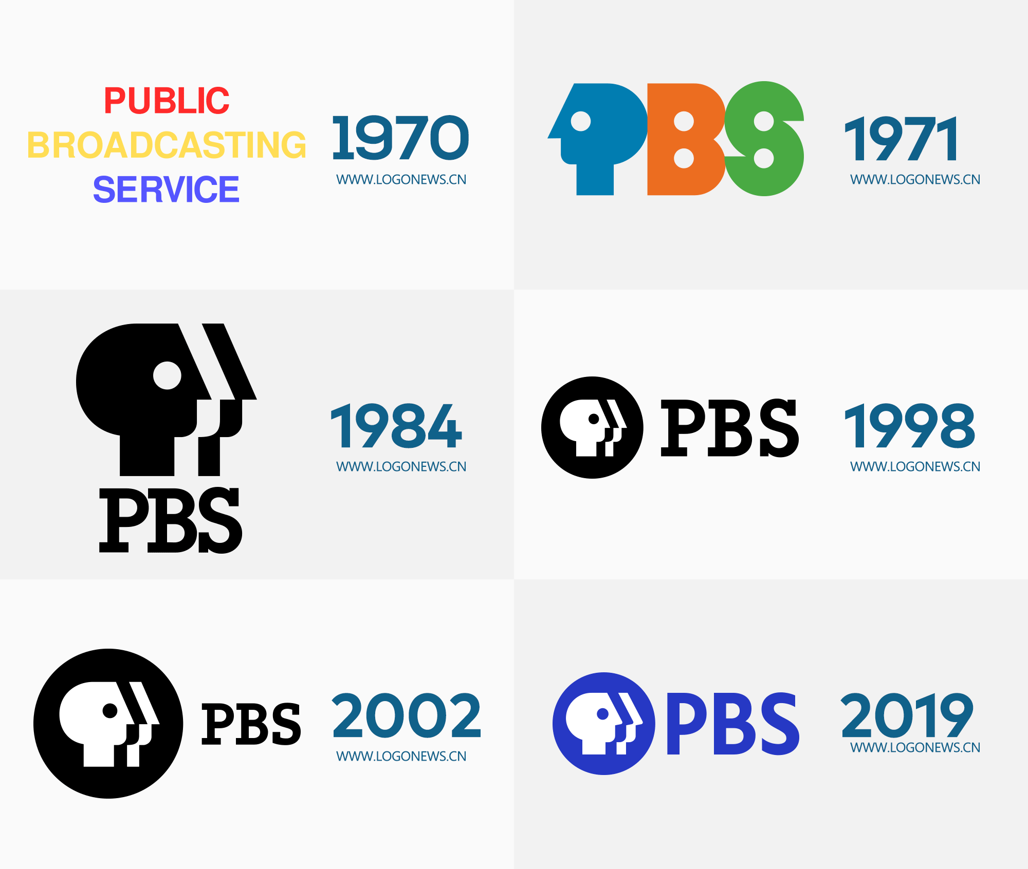 自1998年以來,“P-Head”一直以反白的形式放置在黑色圓圈中,然后用 Caecilia75Heavy 代替Herb Lubalin在1971年設(shè)計(jì)的 LubalinGraphDemi 字體。1971年,美國平面設(shè)計(jì)師Herb Lubalin(1918-1981)設(shè)計(jì)了PBS經(jīng)典的“P”頭商標(biāo)。1984年,Chermayeff & Geismar公司由Ivan Chermayeff和Tom Geismar共同創(chuàng)建,重新修改了“P-Head”圖標(biāo),將其鏡像旋轉(zhuǎn)到一個(gè)方向,并添加了兩個(gè)額外的面部輪廓(一個(gè)在負(fù)空間,另一個(gè)在正空間)。