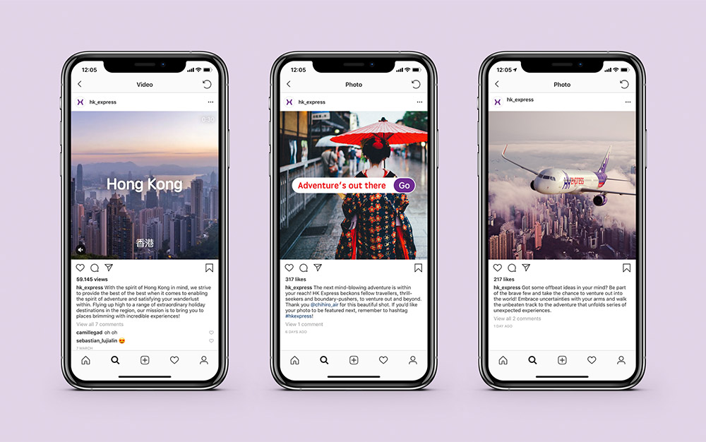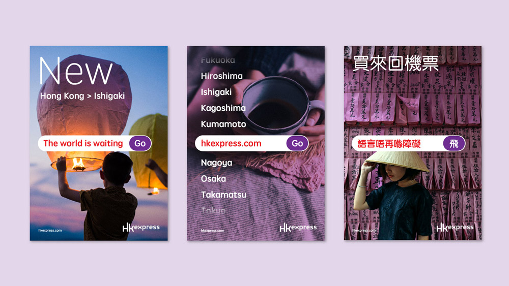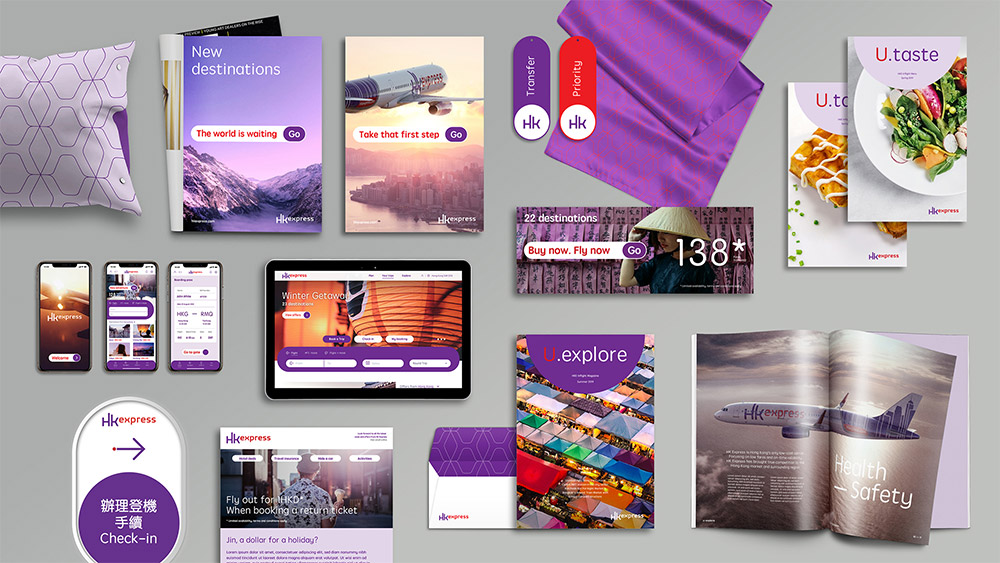 HK Express的嶄新品牌形象將應(yīng)用于各種宣傳媒體,設(shè)計(jì)元素包括精心設(shè)計(jì)的服務(wù)及設(shè)施標(biāo)志、簡(jiǎn)潔的插畫等,從而提升傳播效能。例如,在展示時(shí)刻、風(fēng)景及人物時(shí)將采用富感染力的相片;在表達(dá)品牌形象時(shí),則使用深紫與桃紅兩個(gè)品牌主色設(shè)計(jì)出含意鮮明的插圖。