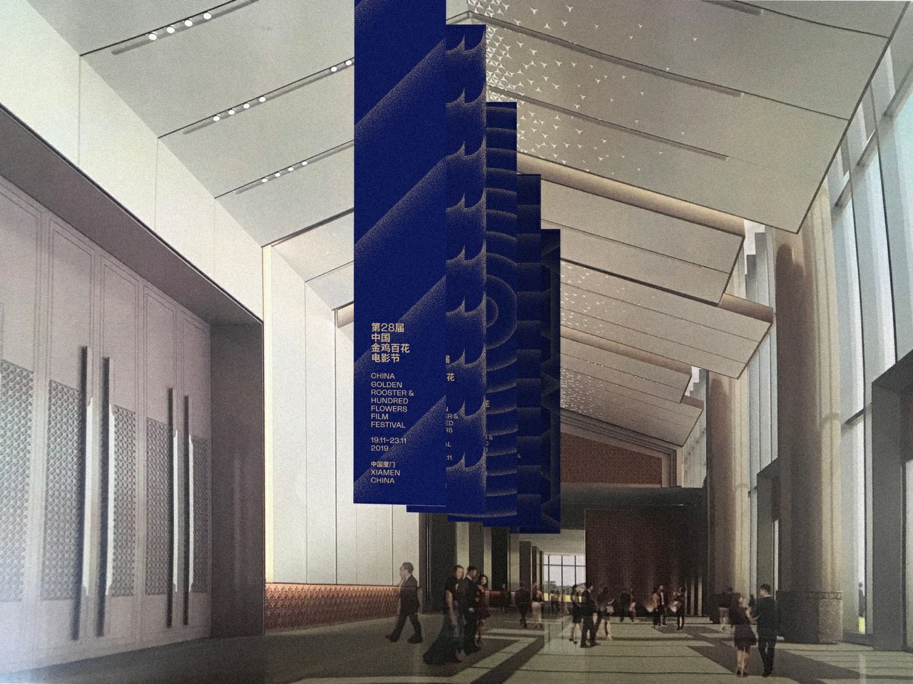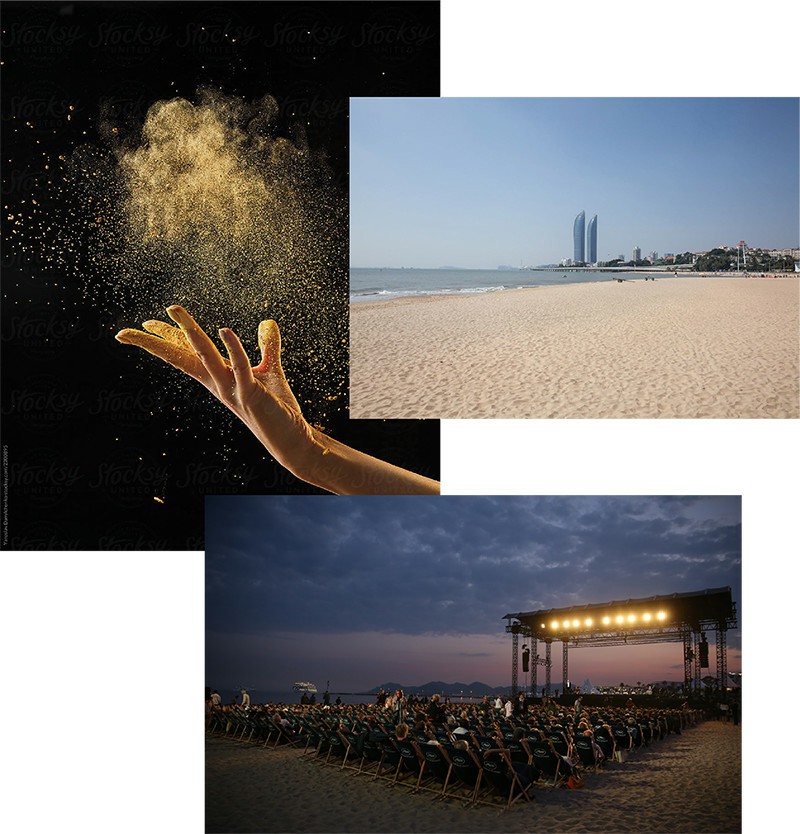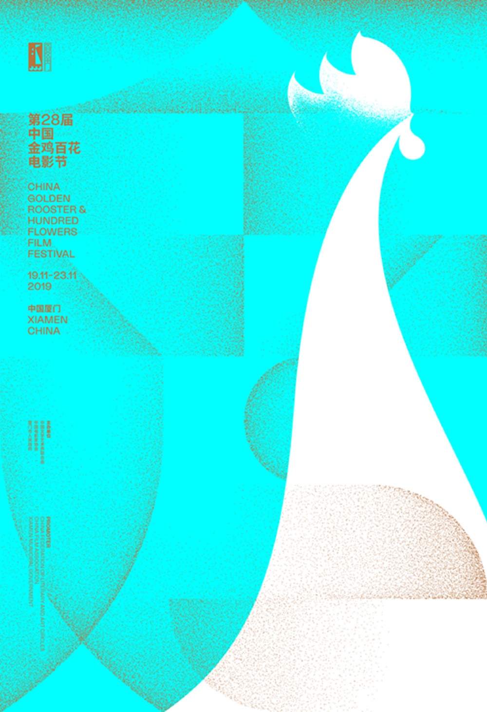 海報設計靈感源自“大浪淘沙始見金”,背景是金色沙粒組成的“金雞”字樣,秉承簡約、大氣的風格,選擇雄雞作為前景,雄雞的造型蘊含著大海中“揚起的帆、回家的路”的意象,以金沙為元素,并配以海藍色和墨色為底,以傳達金雞獎回歸初心的溫暖寓意。
