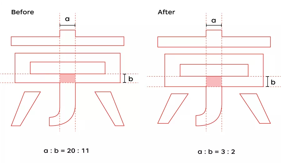以“京東”二字為例,首先,我們對橫豎比例進行了調(diào)整。原來的“京東”二字,橫比較細豎比較粗,為了強化力量感的傳達,設(shè)計師反復(fù)思考、不斷嘗試,最后將字體橫豎比例定為了2:3。橫豎比例的改變,讓整個字的灰度變得穩(wěn)定、均勻,也顯得更穩(wěn)重、更有力量感。