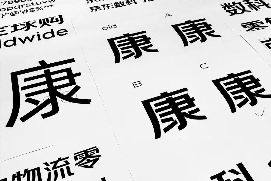 除了對原來LOGO的“京東”二字做調(diào)整,方正設(shè)計團隊還對橫豎撇捺點勾提轉(zhuǎn)折豎彎鉤等各個筆畫都做了造型,通過30多個字確定了基本筆畫之后,接下來通過130多個字逐步確定了字體的基本部件。