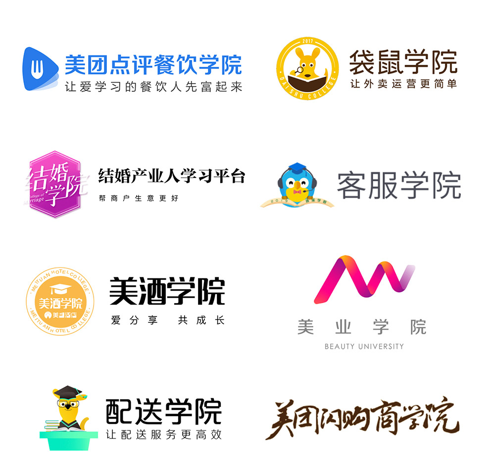 另外,下設(shè)的八個(gè)學(xué)院也分別有自己獨(dú)立的品牌LOGO。如美團(tuán)點(diǎn)評(píng)餐飲學(xué)院以藍(lán)色調(diào)為主,圓融的藍(lán)色三角圖標(biāo)中有一個(gè)象征餐飲的刀叉。袋鼠學(xué)院和配送學(xué)院直接用了美團(tuán)的吉祥物袋鼠。美酒學(xué)院的LOGO看上去更正式嚴(yán)肅一點(diǎn),除了有代表智慧、學(xué)識(shí)的博士帽外,還有美團(tuán)酒店的LOGO放置其中。
