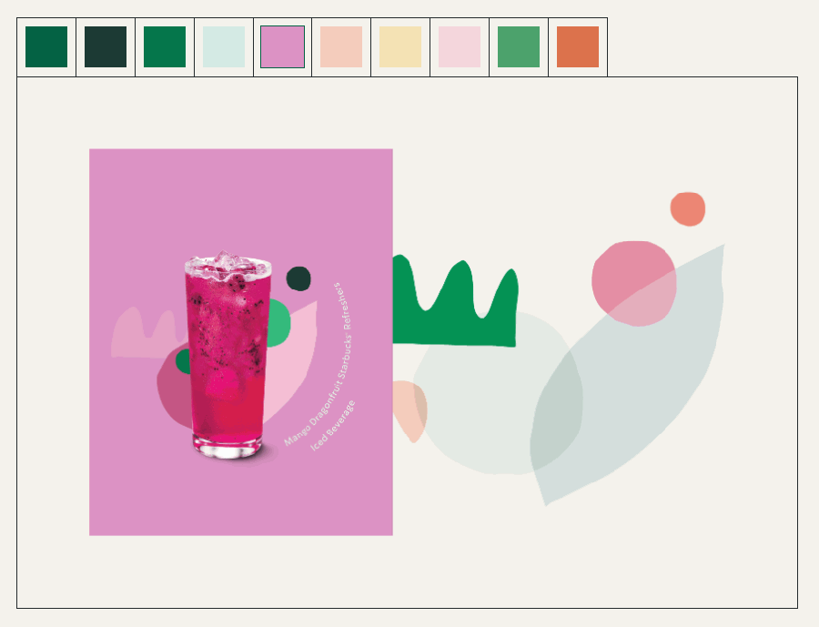 每一季,團隊從新推出的飲品中提取靈感,挑選出流行色調(diào),接著便展開、延伸出一系列的視覺設計,然而,這些都得回歸星巴克最具代表性的顏色——Starbucks Green (PANTONE 3425)。」