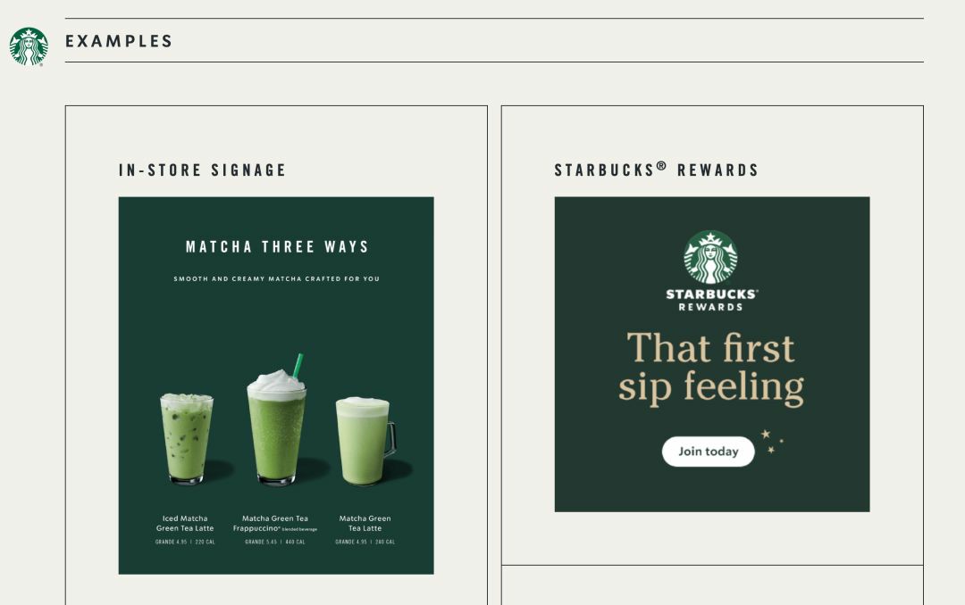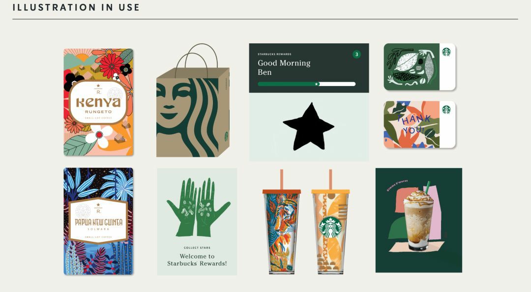 星巴克設計團隊以綠色作為錨點,將視覺風格加以延伸,樹立品牌鮮明印象。