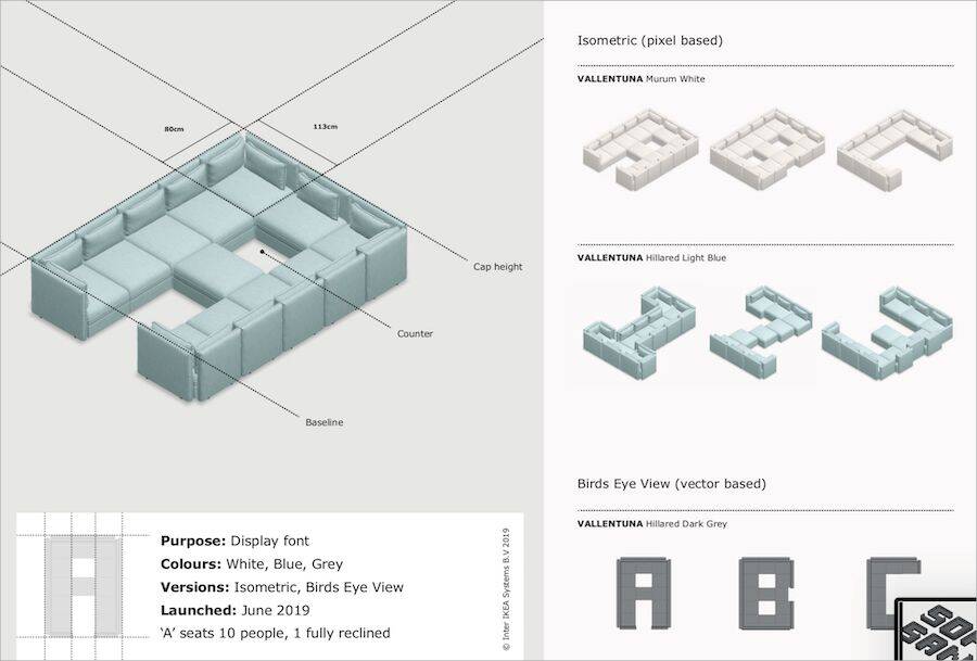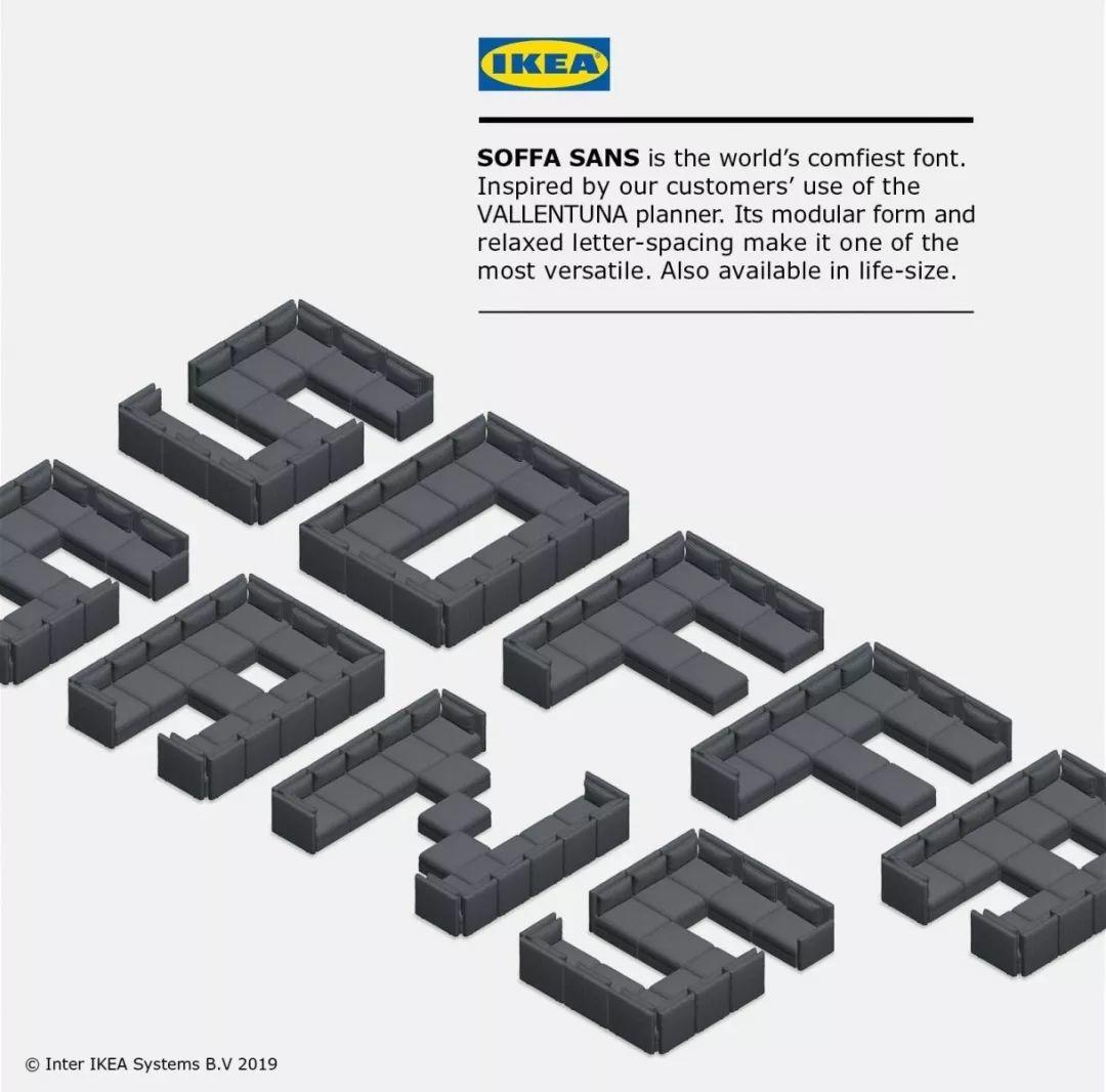 名為“最舒服”,是由于這套字體是全部由宜家旗下各式各款的沙發(fā)組成。想象下自己每次癱倒在宜家賣場(chǎng)沙發(fā)上的樣子,是不是最舒服?