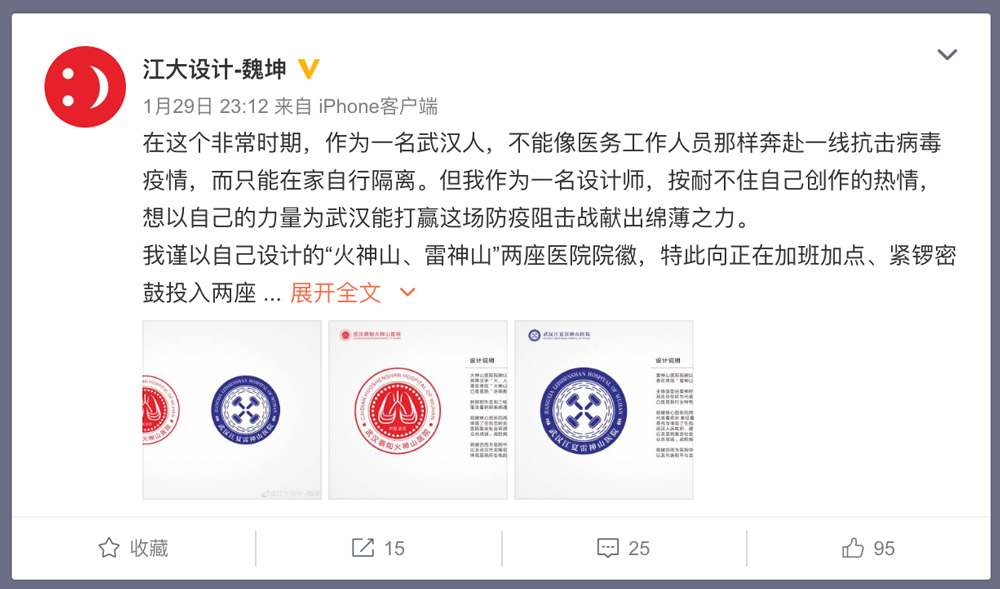 在2023年1月29日,火神山醫(yī)院和雷神山醫(yī)院的LOGO設(shè)計(jì)方案在網(wǎng)絡(luò)上曝光。根據(jù)相關(guān)介紹,這兩個設(shè)計(jì)方案是由江漢大學(xué)設(shè)計(jì)學(xué)院視覺傳達(dá)設(shè)計(jì)系主任魏坤設(shè)計(jì)的。
