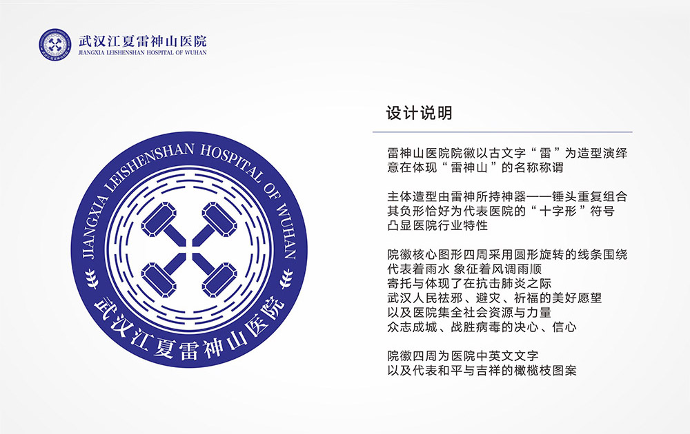 雷神山醫(yī)院的LOGO則以“雷”的古文字為設(shè)計(jì)元素,錘子被作為雷神的神器,四把錘子形成一個“十”字醫(yī)療符號;周圍的旋轉(zhuǎn)線條代表雨水,象征著美好的天氣和未來。與火神山不同,雷神山LOGO的文字中央點(diǎn)綴著象征和平的橄欖枝。