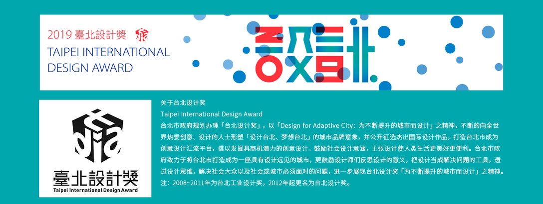 臺(tái)北市政府規(guī)劃辦理「臺(tái)北設(shè)計(jì)獎(jiǎng)」,以「Design for Adaptive City:為不斷提升的城市而設(shè)計(jì)」之精神,不斷的向全世界熱愛創(chuàng)意、設(shè)計(jì)的人士形塑「設(shè)計(jì)臺(tái)北、夢(mèng)想臺(tái)北」的城市品牌意象,并公開征選杰出國(guó)際設(shè)計(jì)作品,打造臺(tái)北市成為創(chuàng)意設(shè)計(jì)匯流平臺(tái),借以發(fā)掘具商機(jī)潛力的創(chuàng)意設(shè)計(jì)、鼓勵(lì)社會(huì)設(shè)計(jì)意涵,主張?jiān)O(shè)計(jì)使人類生活更美好更便利。