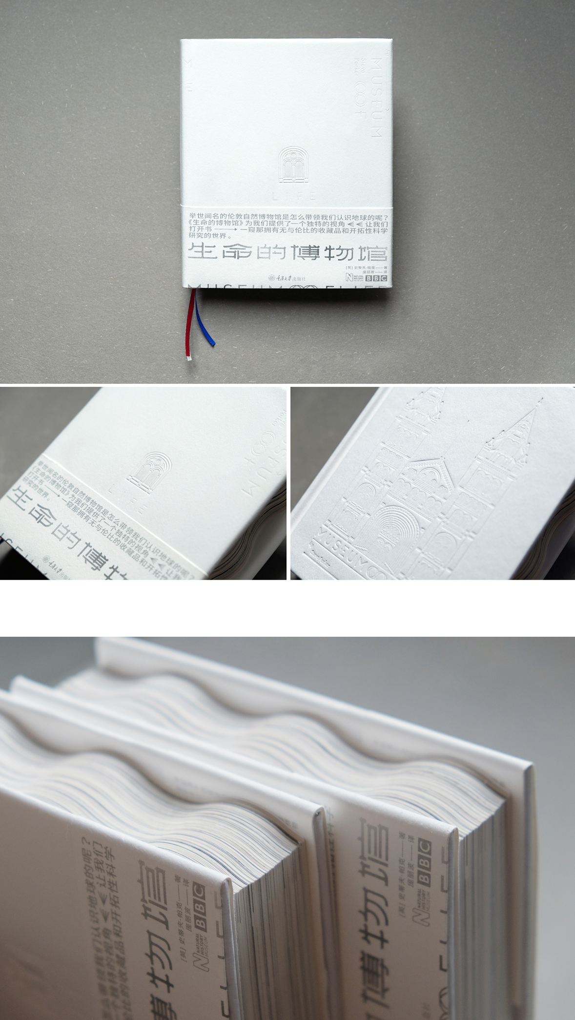 這是一本關(guān)于倫敦自然博物館的書。將書的設(shè)計(jì)開本調(diào)到非常小,書口處特意設(shè)計(jì)為波浪形態(tài),使書本身更具生命的“立體感”與“流動(dòng)感”。書中紅、白、藍(lán)三根書簽帶也象征著生命的動(dòng)脈與靜脈。書由外及內(nèi),采用大量純凈的白色,僅把信息用燙透的形式印制其上,想要直觀表現(xiàn)人們行走于博物館中的感受,也表達(dá)了自然生命由小見大,需我們留心觀察自然才會(huì)在你眼中展現(xiàn)出另一番景象的觀點(diǎn)。