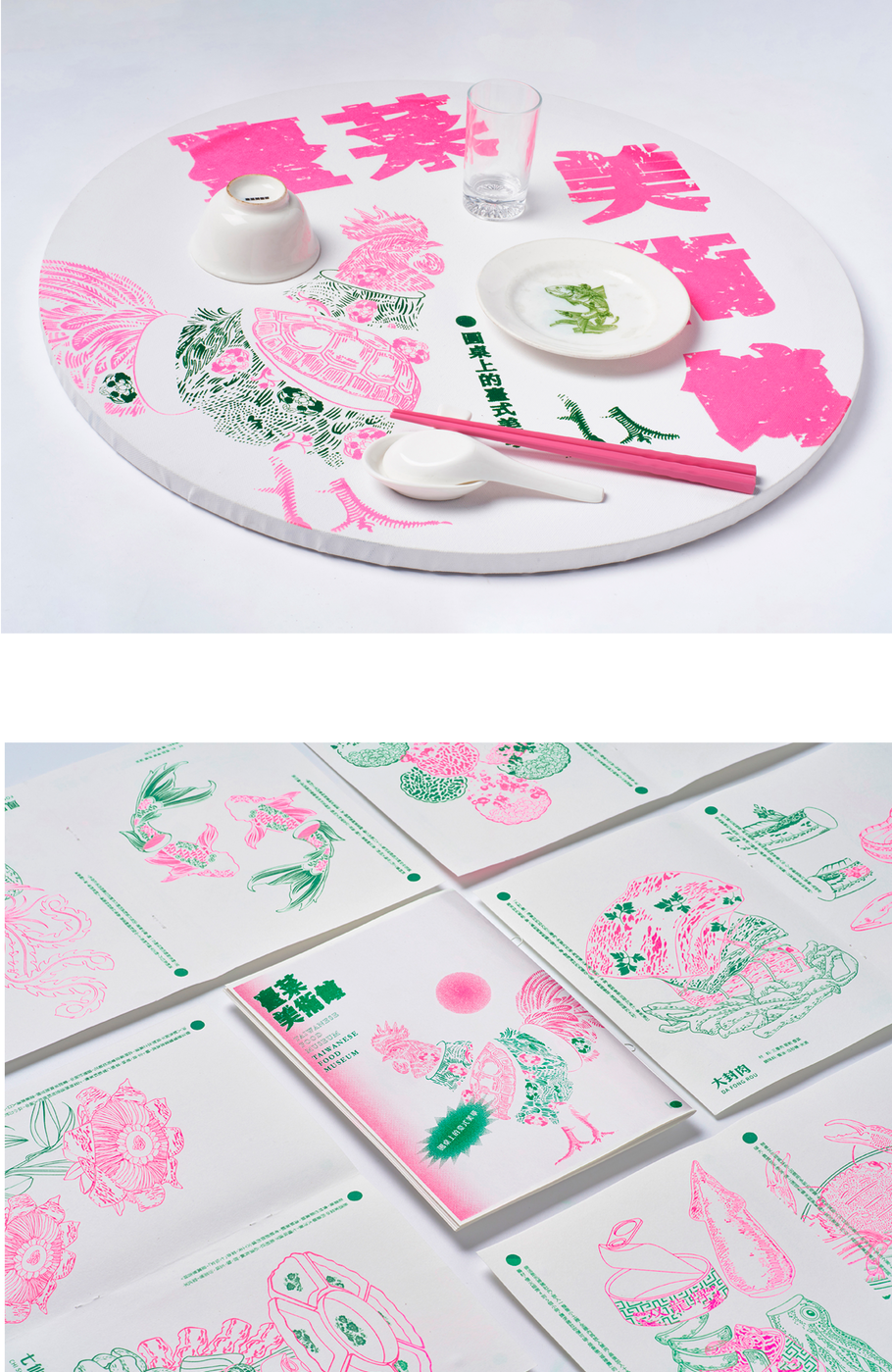 臺(tái)灣為移民社會(huì),在飲食上融合多元文化,我們希望透過手路菜重新分類并梳理出屬于臺(tái)菜的臺(tái)式美學(xué),讓傳統(tǒng)與現(xiàn)代共存,達(dá)到藝術(shù)向下扎根與文化認(rèn)知向上延展的目的。 視覺設(shè)計(jì)運(yùn)用線性解構(gòu)的方式, 勾勒出臺(tái)灣料理的淬鍊與工法,從早期器皿上的紋飾延伸到插畫中,讓傳統(tǒng)與創(chuàng)新得以緩慢交融。 配色上選用代表臺(tái)灣人文精神的臺(tái)灣紅「桃粉色」做為核心,取樣出獨(dú)具特色的熒光粉搭配對(duì)比的綠色,使整體在理性美學(xué)與野性臺(tái)味中找到平衡。 輸出上大量使用網(wǎng)版印制的方式,讓油墨一層一層堆棧,道出臺(tái)灣早期經(jīng)典料理多是運(yùn)用套疊菜色的烹調(diào),展現(xiàn)多層次的口感及文化底蘊(yùn)。 期望透過臺(tái)菜美術(shù)館的視角,引導(dǎo)觀者從20道插畫中,思考美學(xué)于臺(tái)灣料理的精神及價(jià)值,在不斷推演的飲食文化中,發(fā)現(xiàn)臺(tái)菜于生活中的文化路徑。