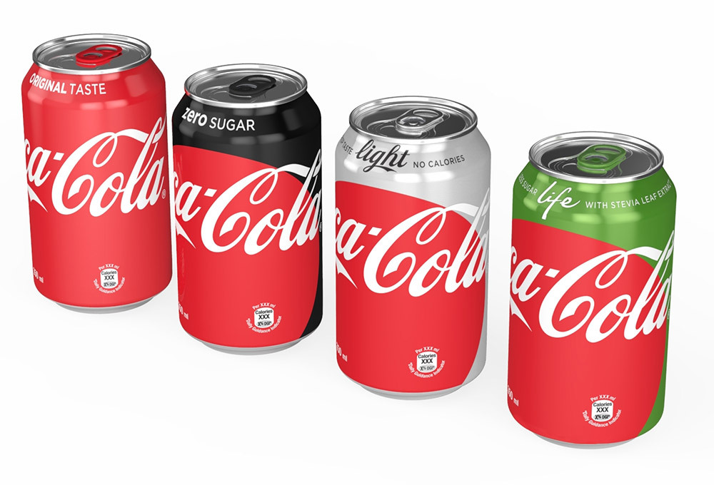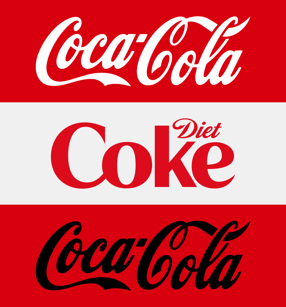 當(dāng)紅色和白色的可口可樂(lè)LOGO搭配時(shí),這就是可口可樂(lè),當(dāng)LOGO變?yōu)楹谏褂迷诩t色背景時(shí),它就是零度可樂(lè)(Coke Zero)。而健怡可樂(lè)(Diet Coke)將以其標(biāo)志性的銀色背景和紅色LOGO出現(xiàn)在可口可樂(lè)的商標(biāo)設(shè)計(jì)家族中。