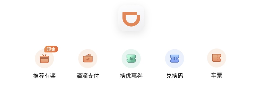 而滴滴的圖標設計則是通過提煉 Logo 的圖形特征(上圓下方),形成新的圖形。滴滴品牌基因塑造一直是比較出彩的,最早版本的圖標設計就很注重這方面,下面是我截的最新版本圖。