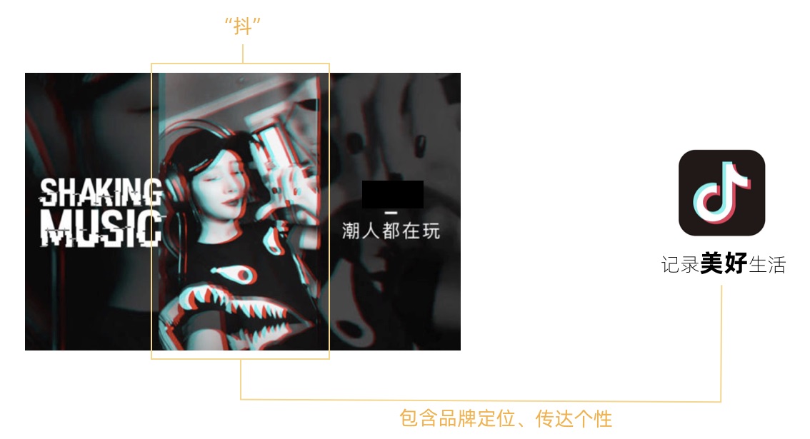 相信大家一眼就能看出,那你是通過什么元素辨別出來的呢?我們拆解一下(如下圖),首先圖形里包括了抖音的“抖”的設計風格,其實這種撞色風格實際上并不是抖音的專利,但自從抖音以此風格作為主要設計風格,大家便形成了這樣的品牌印象,其次我們看一下人物形象——一個年輕又好看的女孩,而人物形象的選擇則代表了其定位,這就很好的傳達抖音的品牌個性。