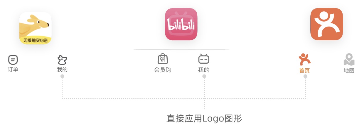 提煉品牌基因最常見的手法是從 LOGO 中提取圖形,圖形可以直接將 logo 應用在界面上,也可以簡化 logo 特征形成新的圖形。比如,美團,B 站等直接將 LOGO 應用在圖標設計上。