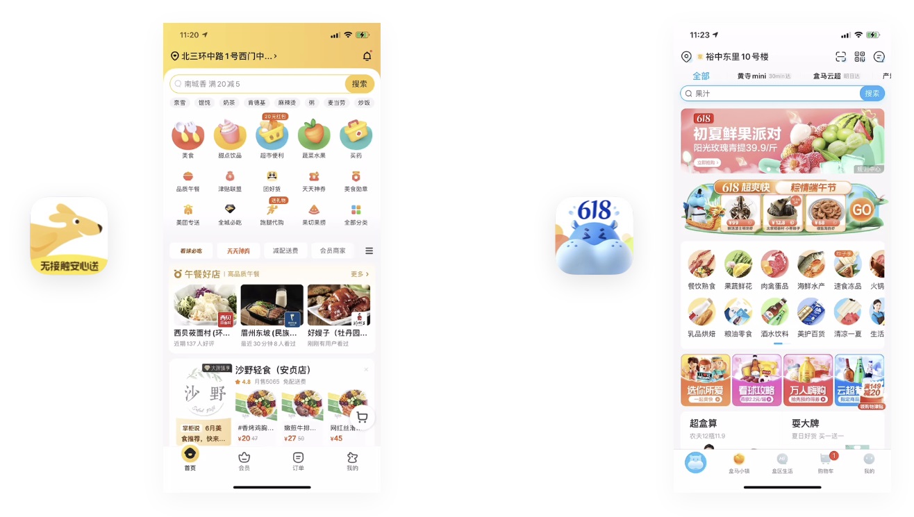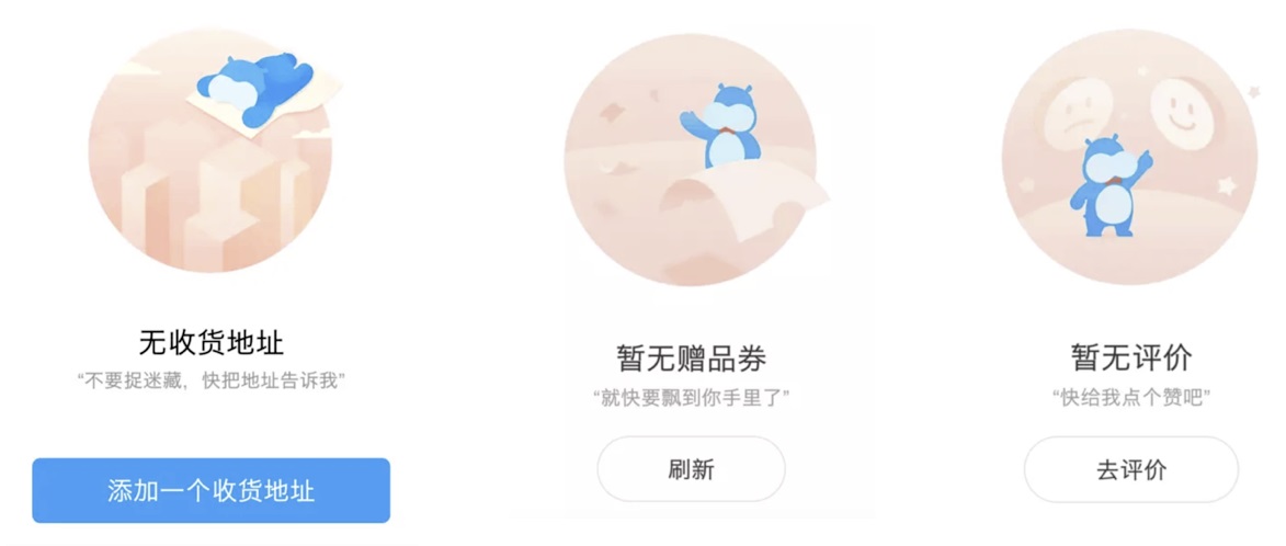 第三個場景:loading,包括下拉刷新和頁面加載。首先我們先看一下美團,直接應用了美團的 IP-袋鼠的形象,飛速奔跑的 motion,既能體現(xiàn)外賣特性又富趣味性。盒馬生鮮,他沒有直接應用盒馬的形象,而是提煉了 logo 里的有特征性的圖形做 loading。這兩種方法在 app 里用的都比較廣,也是設計師常用的方法。