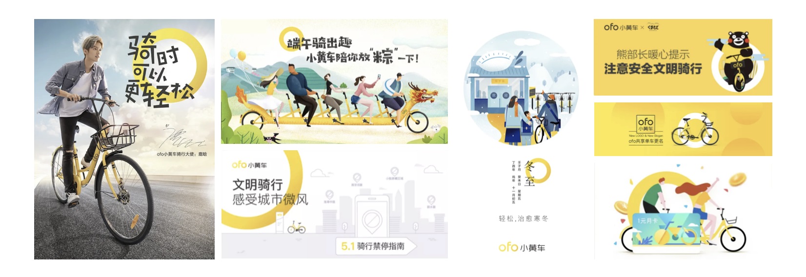 我們再來看一下 ofo 的廣告圖,官方海報通過當時最受年輕人喜歡的愛豆之一作為品牌代言人,其充滿活力的騎著小黃車;整體物料的設計頁面元素透氣,輕盈;這正是 ofo 想要傳達給用戶的直觀感受——輕松、活力。