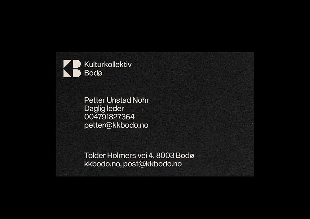 設計團隊提供的解決方案是通過兩個基本形狀(三角形和半圓角矩形)構成抽象的“B”和“K”字母符號。Beddingen kulturhus雖然由Kulturkollektiv Bodø 管理,但它們是兩個實體,因此兩者的LOGO有各自獨特的符號,同時又有明顯視覺關聯(lián)性。