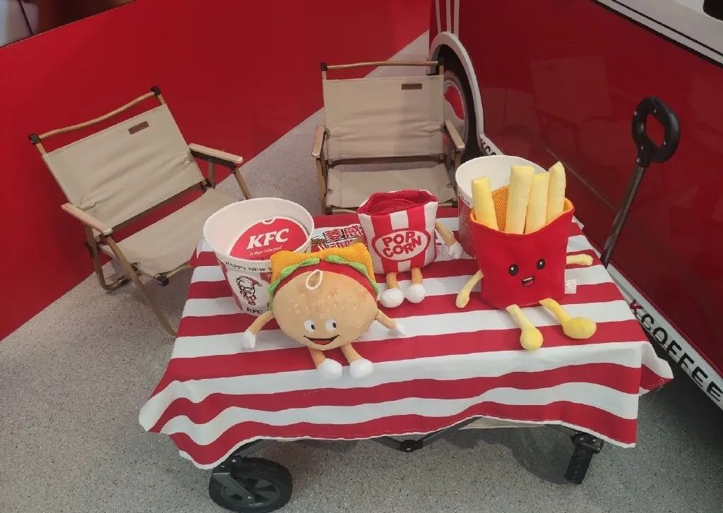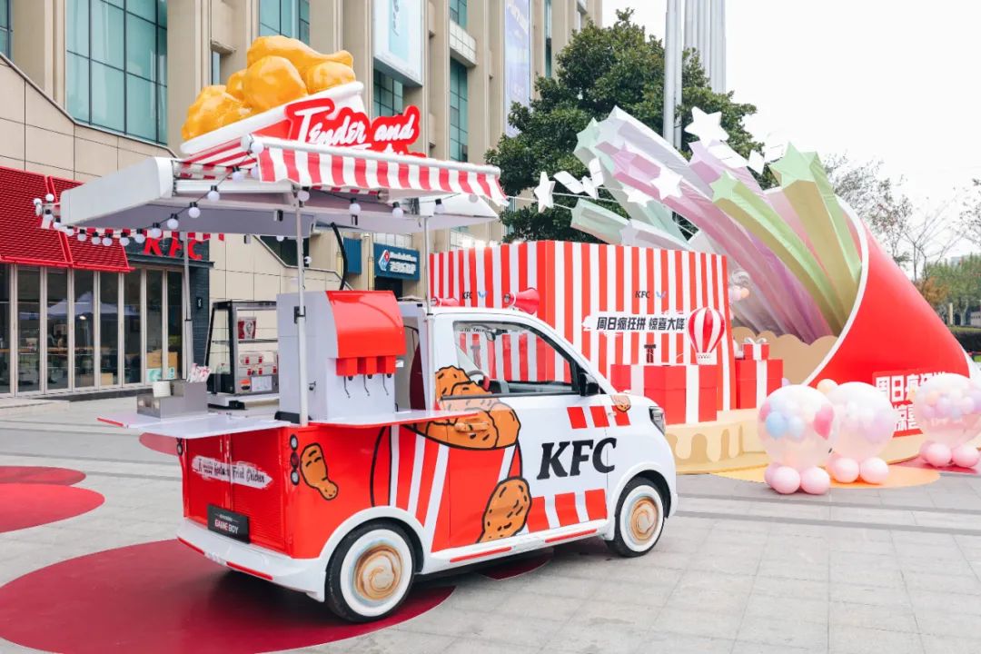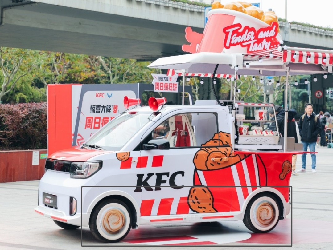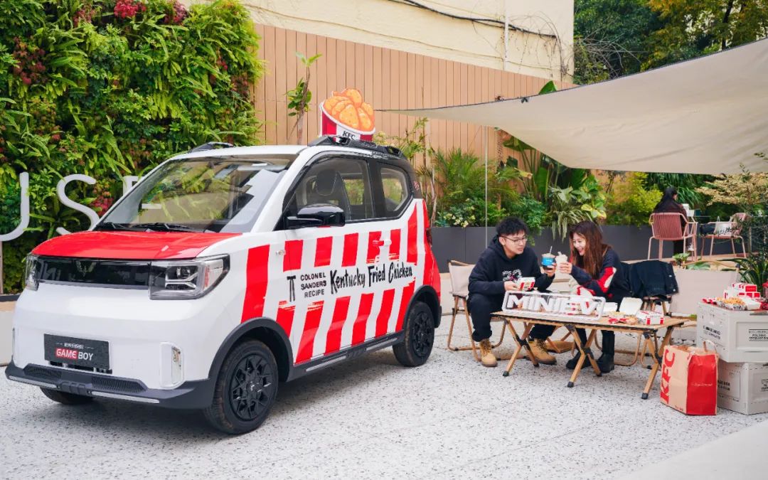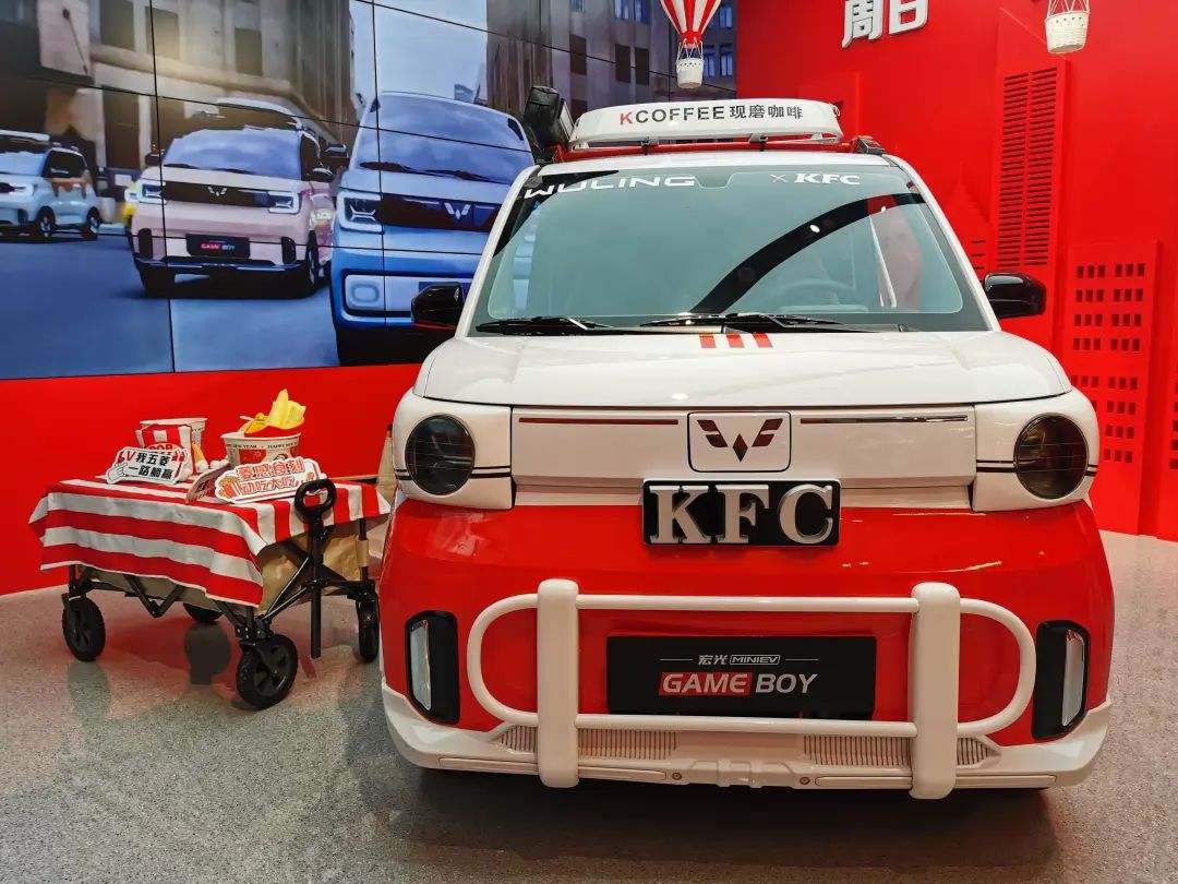 除此之外,還有另一款號(hào)稱為“最KFC風(fēng)的潮玩店”車型,以宏光MINIEV GAMEBOY車型為主,一樣是結(jié)合肯德基紅白相間的車貼以炸雞桶元素,打造潮酷的形象。